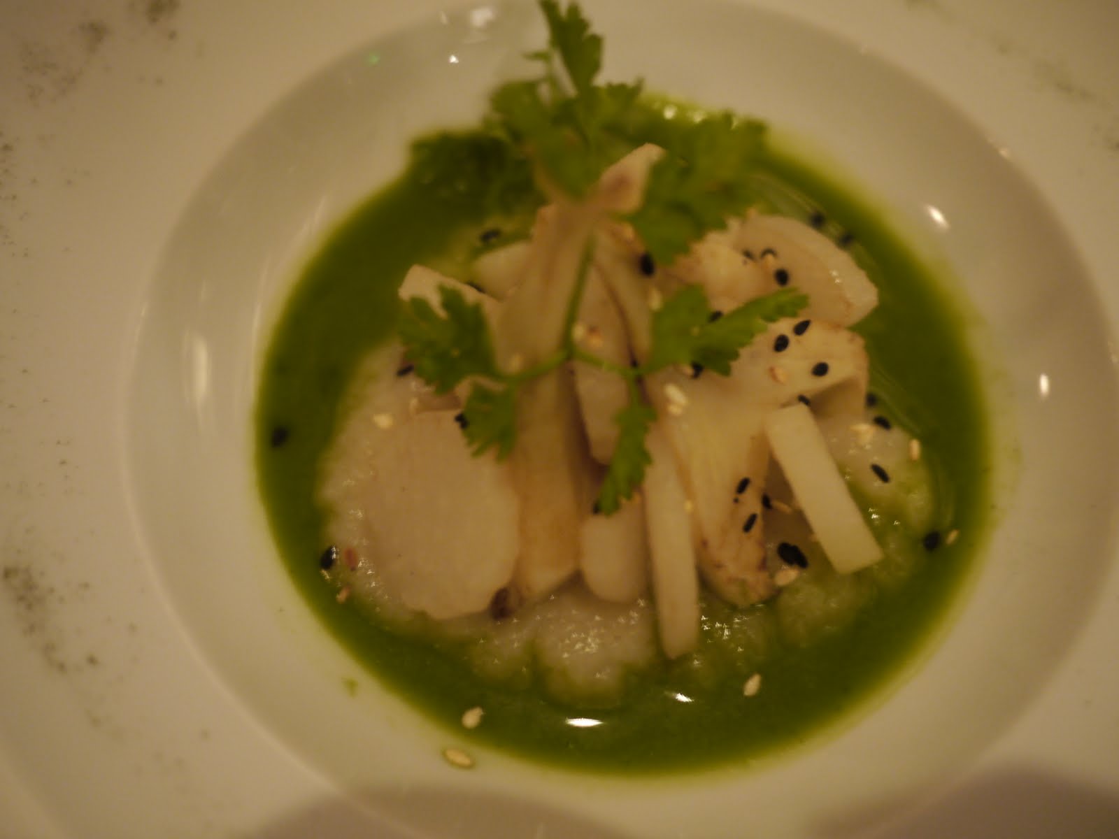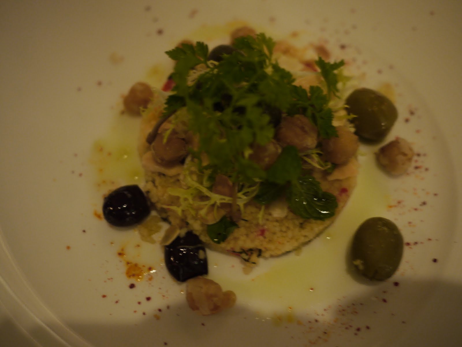 以橄欖油調理的蔬菜丁,佐以線密花椰慕斯,清爽宜人