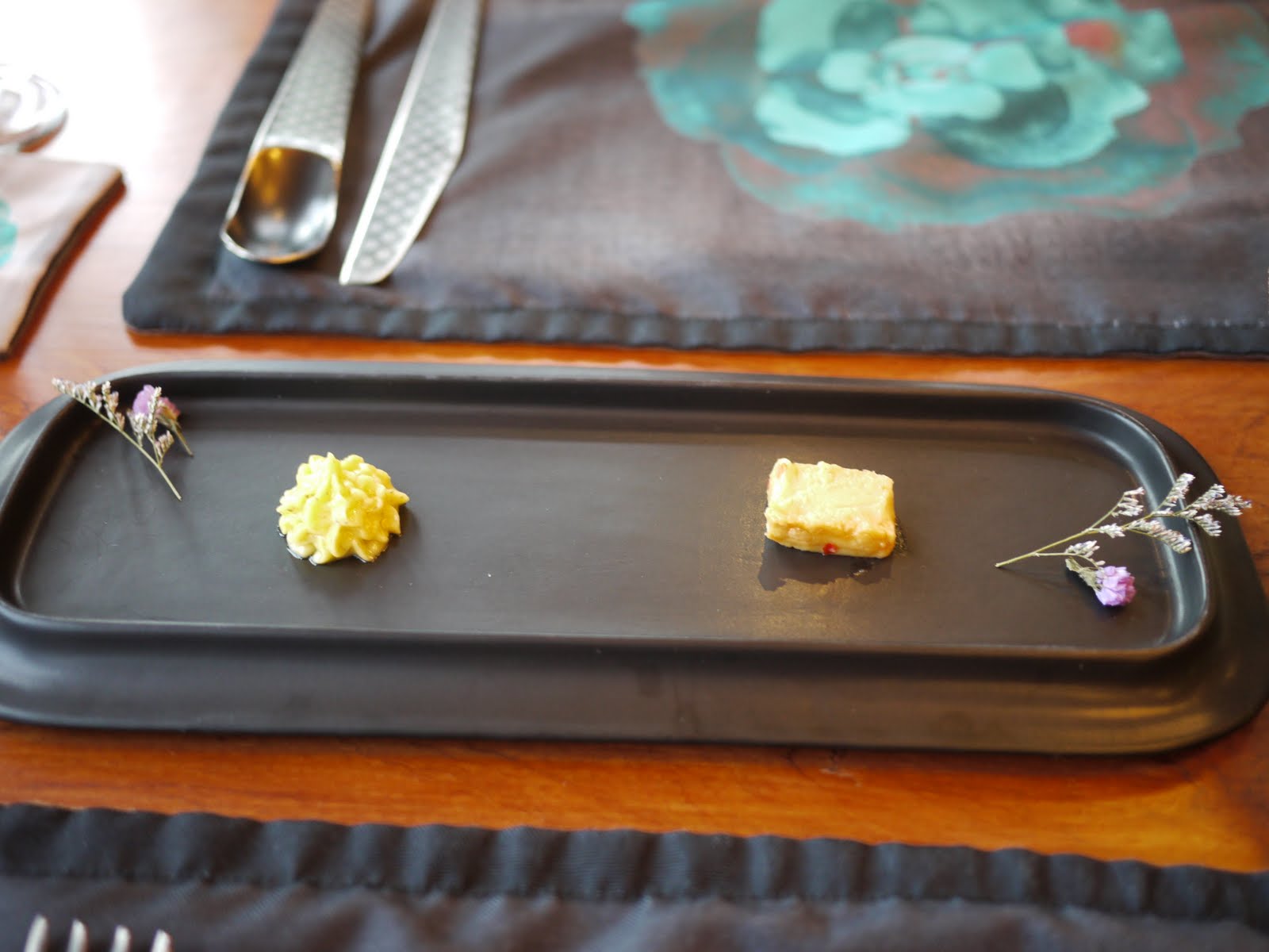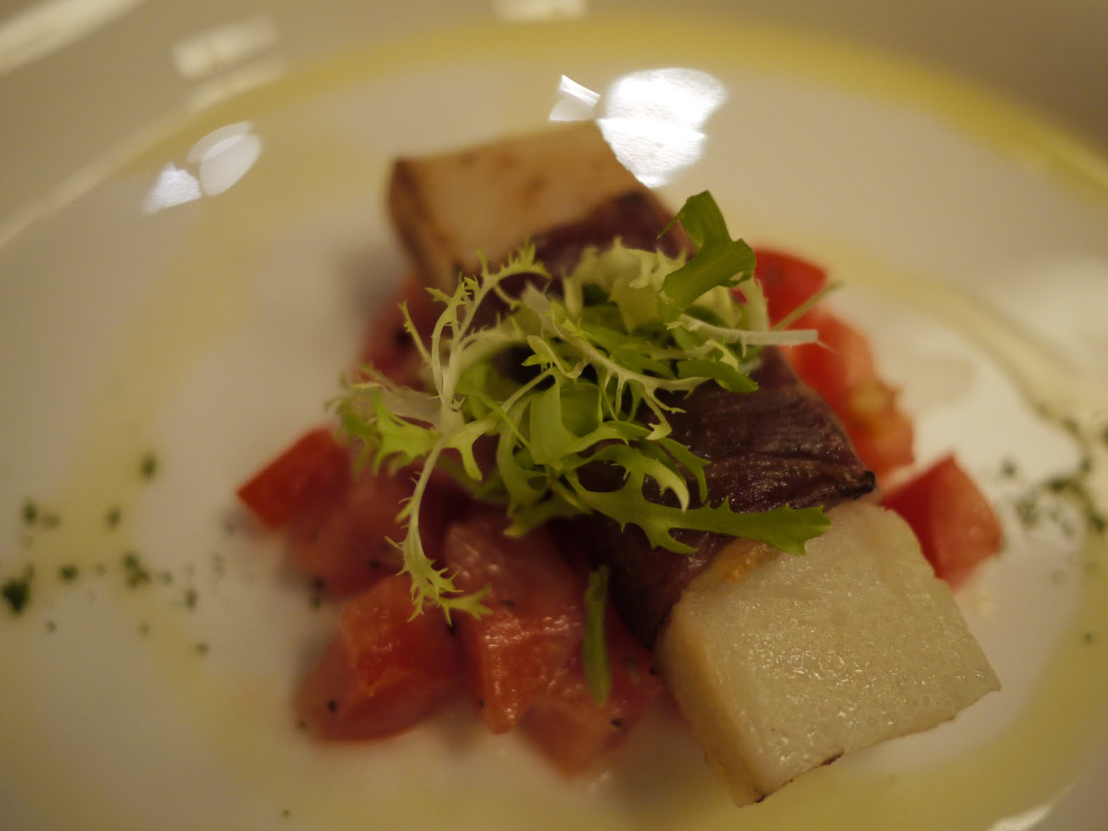 Tofu and sous vide salmon with crab and lettuce served with virgin olive oil